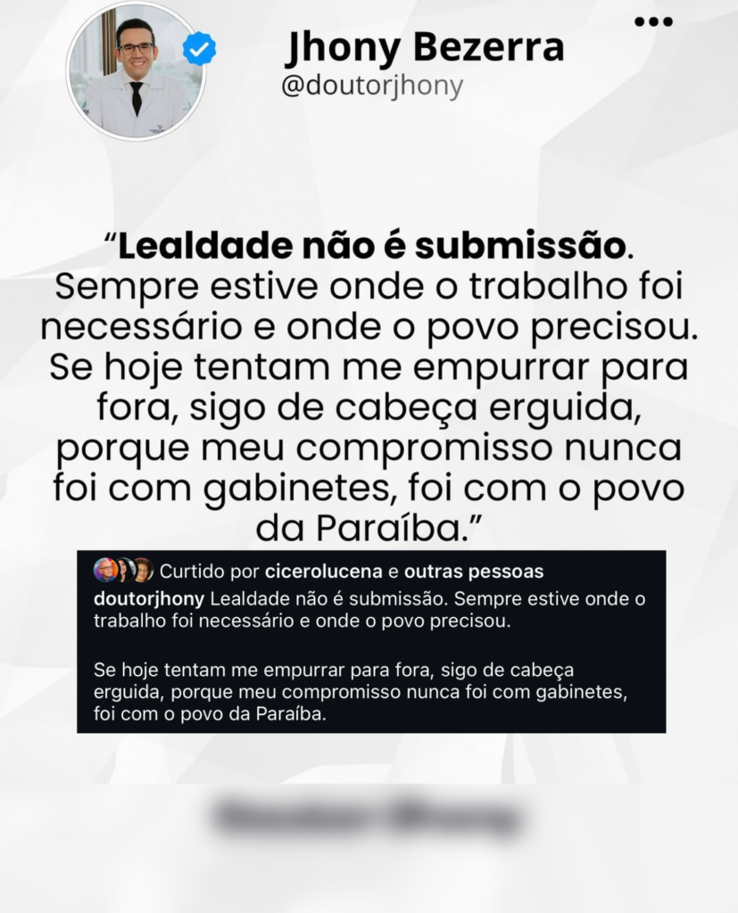 Jhony Bezerra está realmente rompendo politicamente com o governador João Azevêdo. Em uma publicação nas redes sociais no início da tarde desta quarta-feira (11) que teve a curtida de Cícero Lucena, o médico sinalizou a saída do governo. “Lealdade não é submissão. Sempre estive onde o trabalho foi necessário e onde o povo precisou. Se […]